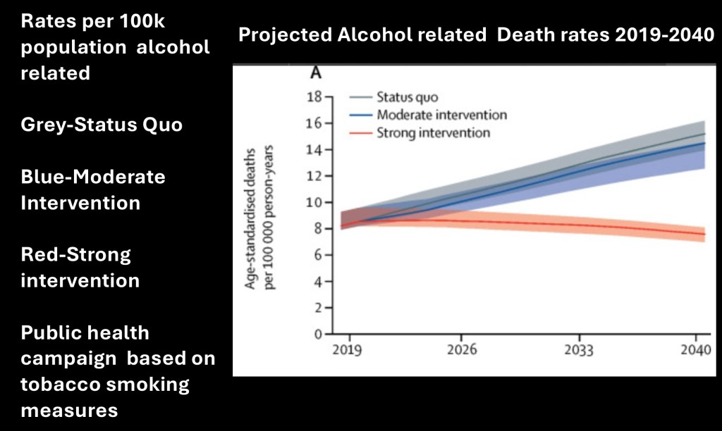 This study utilized existing data to construct a predictive model for projected ALD mortality into 2040. Three different scenarios were included, status quo, mild intervention, or strong intervention. Intervention was defined by anti tobacco public health measures applied to alcohol.