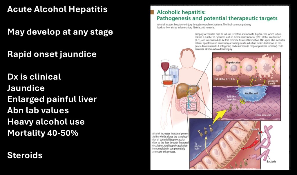 Acute alcohol hepatitis may occur at any stage. It has poor prognosis with mortality rate from 50-60%. Diagnosis is clinical with rapid onset of jaundice and liver tenderness. Encephalopathy, hepatorenal syndrome, encephalopathy, ascites, edema and abnormal lab values are clinical signs and symptoms.