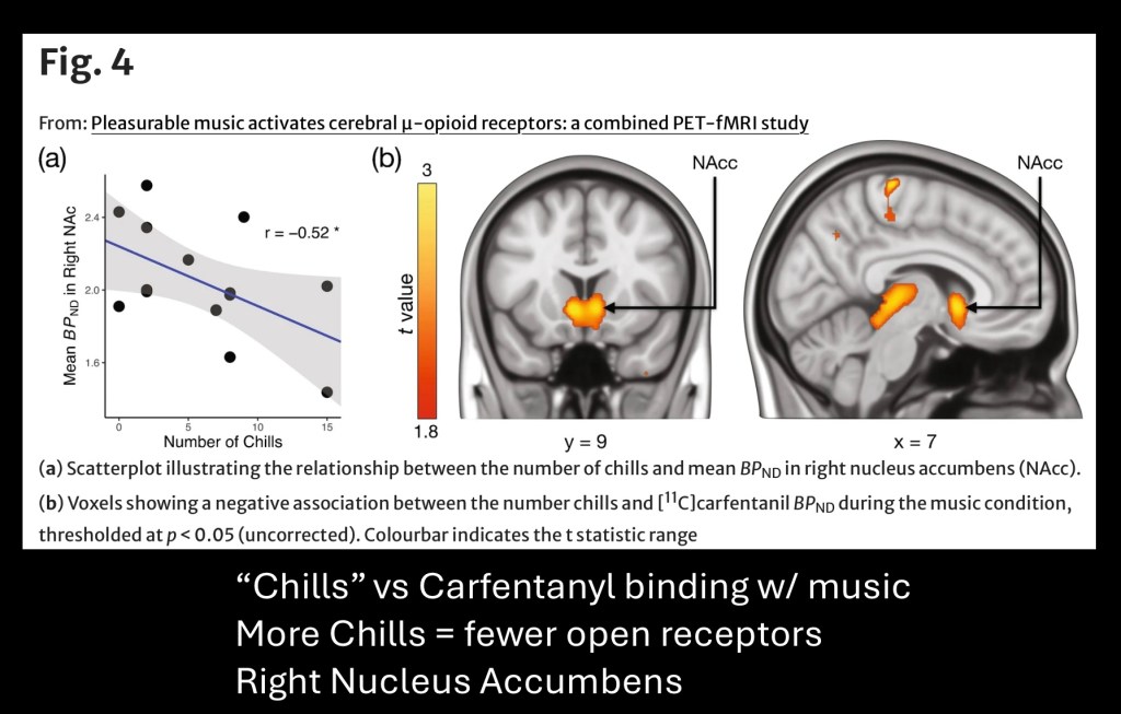 This portion of the study focused on mu receptor binding during episodes of “chills” signifying intense pleasure. The area of interest chosen was the nucleus accumbens, a center known to be essential in reward processing. The graph on the left demonstrates an inverse relationship between chills and mu receptor binding. More chills resulted in fewer open receptors