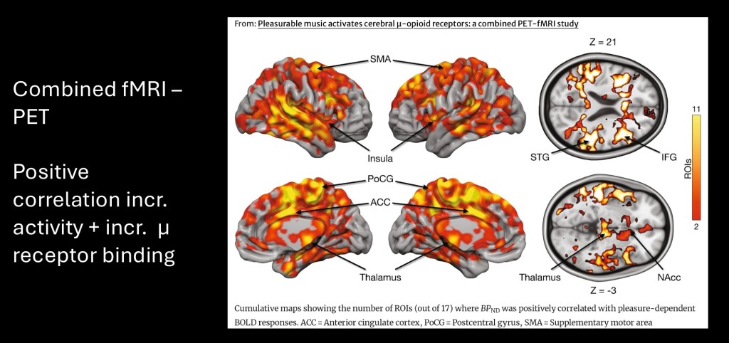 The therapeutic benefits of music are well documented. An excellent post can be found on this website here. There have been studies exploring the neuroscience of how the brain processes and responds to musical stimuli. This post is a brief summary of a recent study published in the European Journal of Nuclear Medicine and Molecular Imaging dated April 2025. The study from a research group in Finland sought to further expand knowledge concerning how the brain processes musical hedonic pleasure and reward specifically looking at the role of the endogenous opioid system.