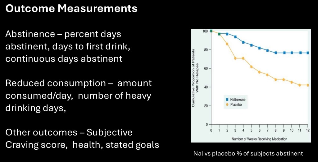 Clinical drug trials are commonly reported in the popular media. To evaluate any results it is important to note the population included and the outcome(s) measured. AUD studies are generally grouped into abstinance oriented such as %days abstinent, days to first relapse, % abstinent during the study period, or consumption oriented such as average consumption/day, number of heavy drinking days, or decrease in consumption since baseline.