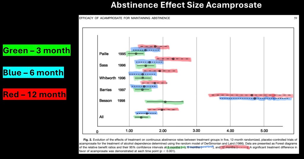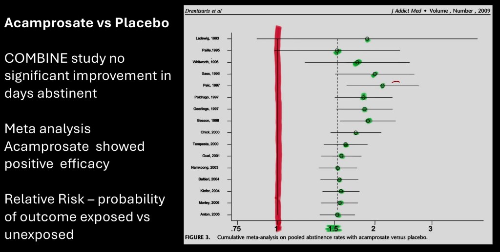 This is from a meta analysis of randomized clinical trials published in j addiction medicine in 2009. The earlier COMBINE study did not demonstrate an advantage of acamprosate over placebo. The authors hypothesized that a large placebo effect seen in that study may have masked clinical benefit identified in previous studies.