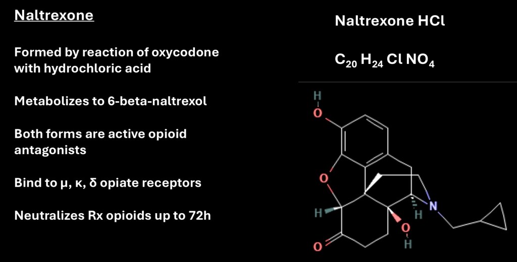 Naltrexone is rapidly metabolized to 6 βnaltrxol which has a longer half life than the parent compound. It is a strong opioid receptor antagonist primarily at μ receptors although it does have activity at κ and δ receptors. One consequence of treatment is prescription opioids are ineffective for up to 72 hours following oral naltrexone which may be an issue in emergency situations or patients receiving opioid medication for chronic pain.