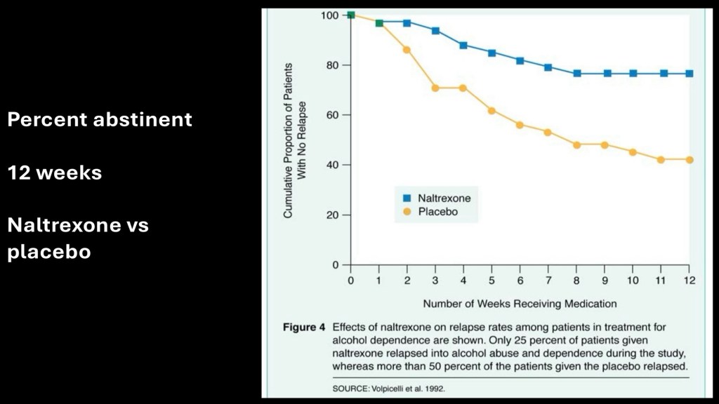 One of the earlier studies on use of naltrexone for AUD. Average subjective craving rating measured during the 12 week trial. Naltrexone subjects are shown in blue. Modest reduction is shown to the 12 week limit.