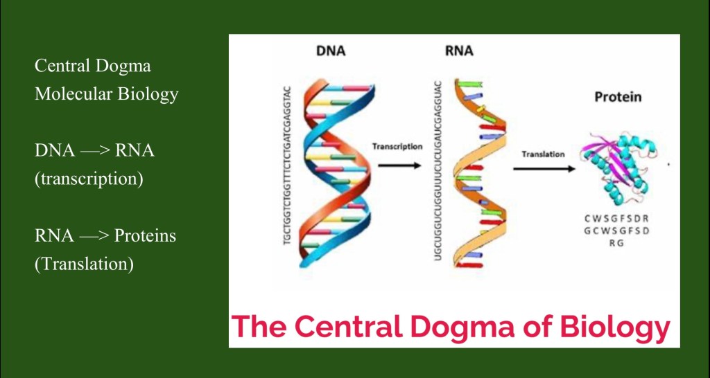 The central dogma of molecular biology was first proposed by Francis Crick. It states that in living things genetic information flows in one direction. DNA code is transcribed to RNA. RNA is translated into proteins.