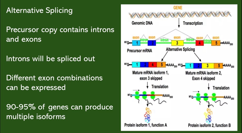 In the schematic above the initial RNA copy contains 5 exons. These can be rearranged to form 2 mRNAs each containing 4 exons. They can each code for proteins with differing properties. These related proteins are known as isoforms.