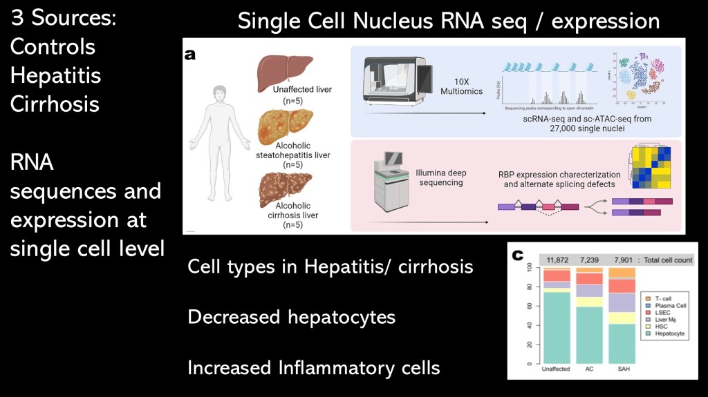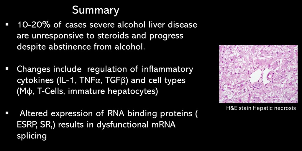A substantial number of cases of severe alcohol liver disease continue to progress despite alcohol abstinence. The molecular mechanisms responsible have been unknown. This study used an in depth approach to identify pathways underlying biological substrates using a number of techniques including RNA sequencing at the single cell level.