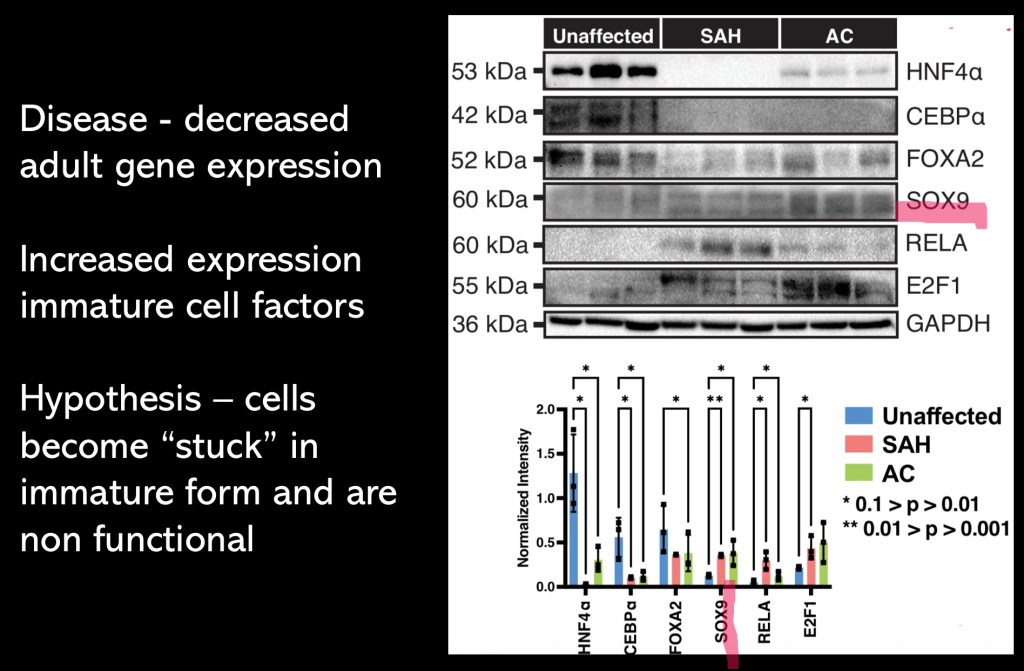 Western blot and graph showing proteins expressed in SAH and AC liver samples vs controls. The first three columns on the left in the graph represent proteins critical in maintenance of mature hepatocytes. On the right the proteins are primarily involved in early development and differentiation.