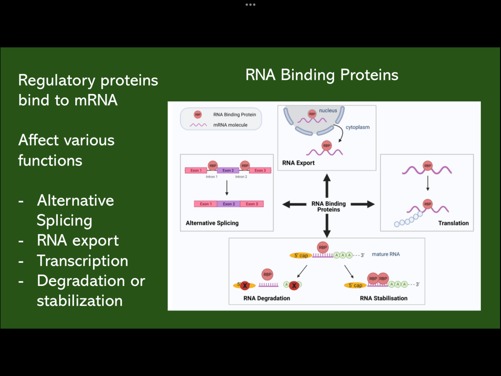 The next part of the study focuses on RNA splicing and RNA binding proteins. RNA binding proteins function in mRNA transport from the nucleus, alternative splicing, protein translation and RNA degradation following translation.