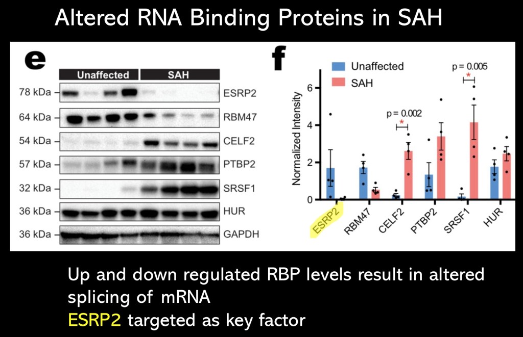 Level of RNA binding protein expression in controls vs SAH. The authors focused on marked decrease in level of ESRP2. It is known to be essential in regulation of pathways essential in maintaining mature hepatocytes. 20% of alternative splicing is controlled by ESRP2.