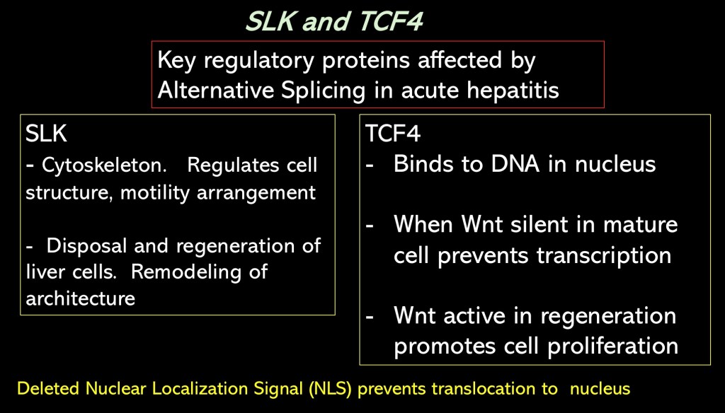 Due to splicing errors SLK and TCF4 fail to translocate into the cell nucleus. Thus, expression of genes required for orchestration of tissue components and transition to new functional hepatocytes is significantly impaired.