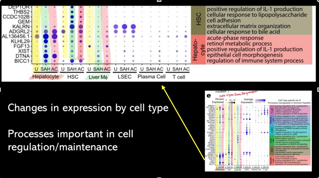 Plot showing expression of genes important in alcohol liver disease by cell type. The corresponding function is shown on the right.