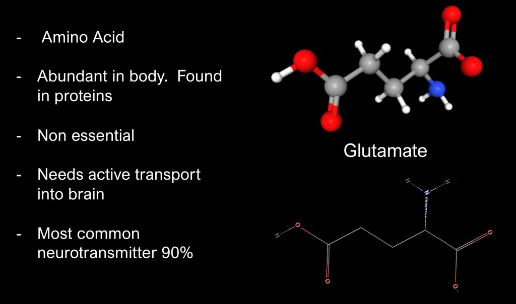 It is the most common neurotransmitter in the central nervous system comprising about 90% of synapses. Glutamate is an excitatory neurotransmitter and diffusely distributed throughout the brain.