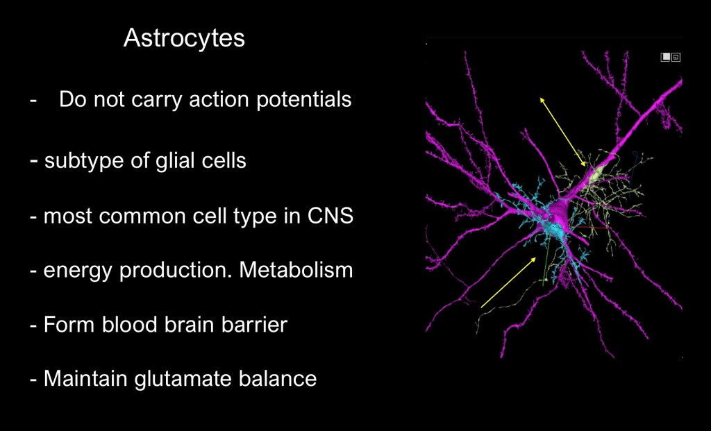 Astrocytes are a subset of glial cells and are the most abundant cell type in the brain. Unlike neurons they do not carry action potentials. Astrocytes surround cerebral blood vessels and have an essential role in maintaining the blood brain barrier. They function in metabolic and immune support roles.