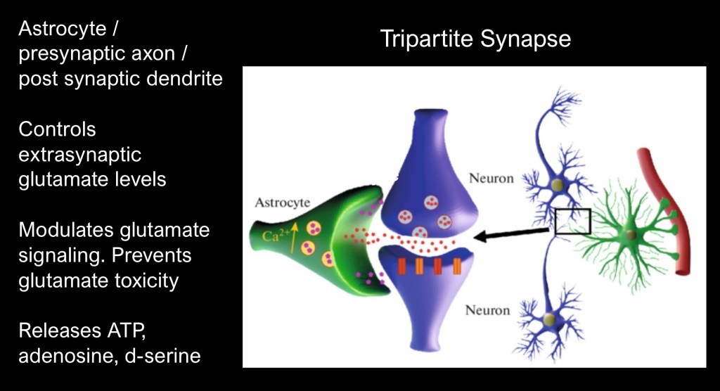 The tripartite synapse is a functional unit composed of a presynaptic axon, post synaptic dendrite, and an astrocyte which wraps around the synaptic space.