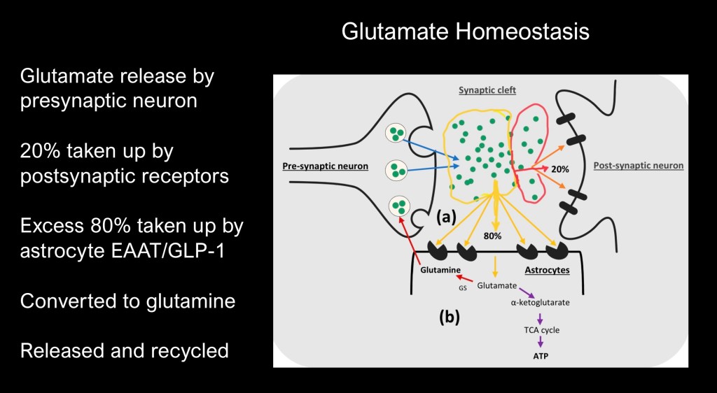 When a glutaminergic neuron releases into the synaptic space only 20% is taken up by postsynaptic receptors. The remainder spills over into the extrasynaptic space and most is taken up by astrocytes. Some of this is metabolized into αketogluterate and processed through the TCA cycle into energy in the form of ATP.