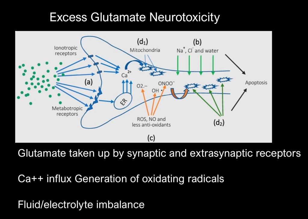 If synaptic levels are too high neuronal toxicity may occur. Excess excitatory transmission releases calcium stores within the cell. This results in mitochondrial damage and generation of oxidizing radicals. Excess water and ionic flow into the cell can result in apoptosis and cell death.
