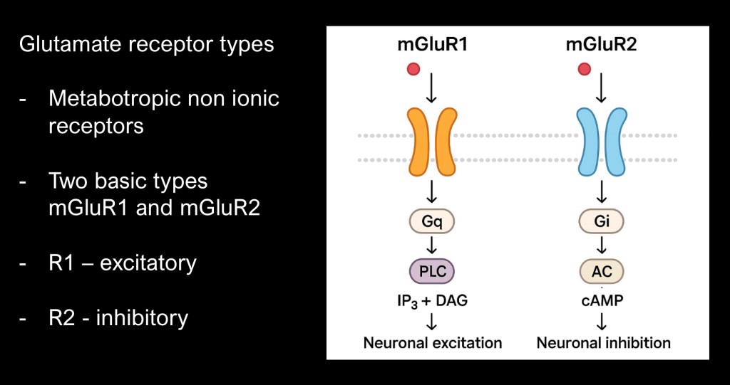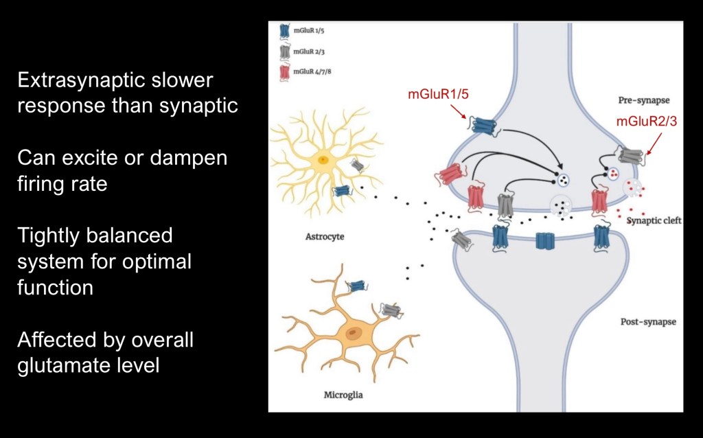 Group 2 (mGluR2, or 2/3) are presynaptic and are inhibitory. Because they are outside the synapse they take slightly longer to act. They serve as an “off switch” for the signal.