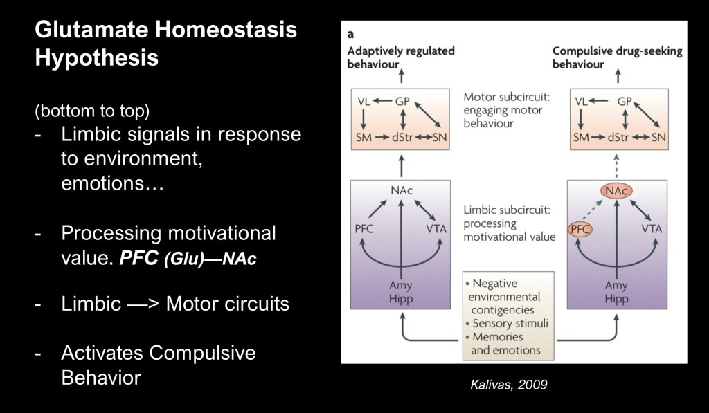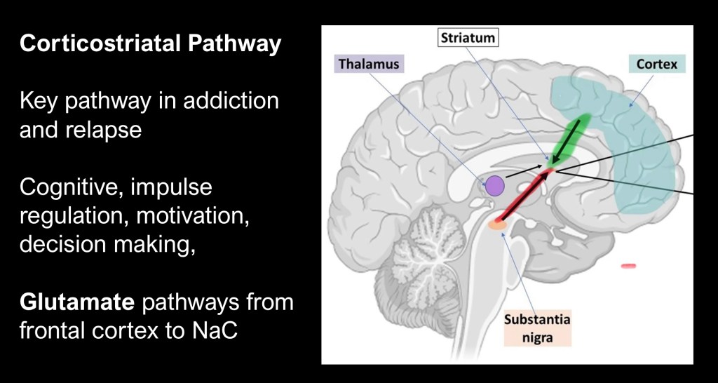 The Glutamate Homeostasis theory of addiction focuses on the Cortical-striatal pathway from the infra limbic cortex to the Nucleus Accumbens and dorsal stratum as a major component contributing to relapse in SUD.