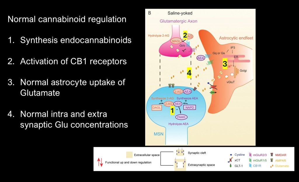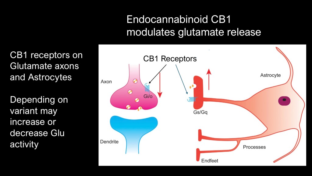 There is a growing body of evidence for a regulatory role played by the endocannabinoid (EC) system in glutamate homeostasis. CB1 receptors are present in synaptic axonal terminals and astrocyte end feet. Activation by endocannabinoids may either promote or inhibit neural activity depending on the G protein involved.