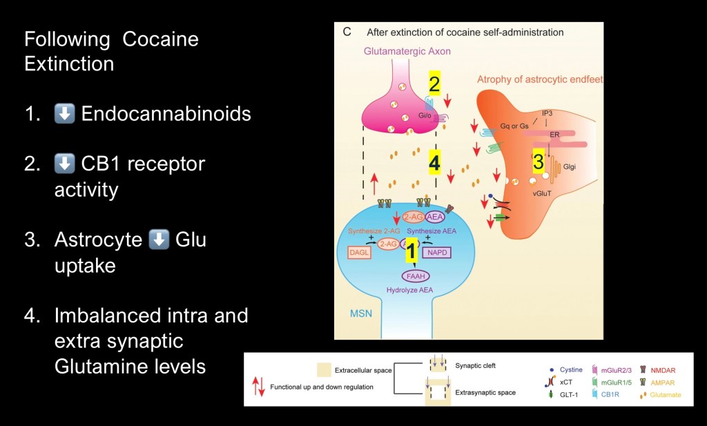 What happens in active addiction. The diagram highlights long term neuroplastic changes in compulsive drug use. Glutamate levels within the synapse are increased and perisynaptic levels are decreased.