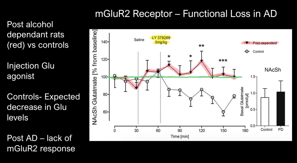 In alcohol naïve rats there is expected drop in extra cellular glutamate due to mGluR2 inhibition. Glutamate levels in alcohol dependent rats remain at baseline indicating lack of functional inhibitory control.