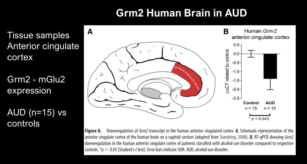 To show correlation in human brain tissue the authors analyzed levels of the precursor gene Grm2 in the anterior cingulate cortex in cadaveric brain tissue from AD and control subjects. Marked decrease in expression was present in alcohol dependent subjects.