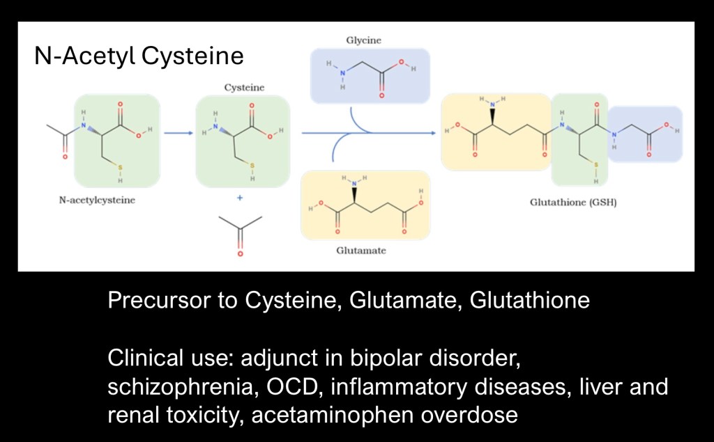 N-Acetylcysteine (NAC) is a precursor of cysteine, glutamate, and glutathione. It crosses the blood brain barrier. NAC has been used as an adjunct to treatment of psychiatric disorders such as OCD, inflammatory diseases, liver and renal toxicity, and prevention of iodinated contrast nephropathy.
