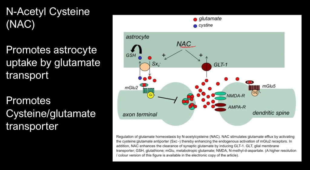 NAC also promotes glutamate transporter activity lowering synaptic glutamate.