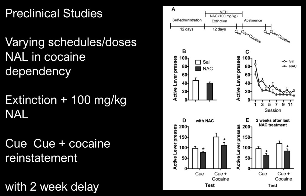 This was a multipart study in rats using a number of NAC dosing schedules in cocaine relapse and reinstatement models under varying conditions.