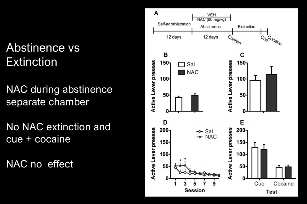 This phase detected no difference between test and control groups when NAC was only given during abstinence. The previous example did detect decreased appetitive behavior when NAC was given during extinction.