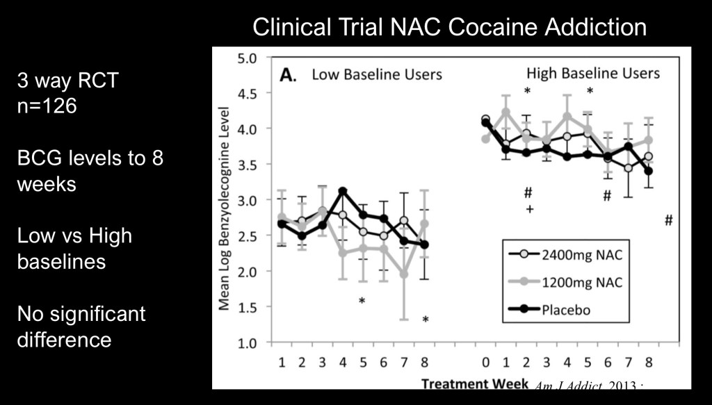 A three way naturalistic human clinical trial of low and high dose NAC in treatment of cocaine use disorder. Subjects (n=126) were grouped into low and high baseline use based on measurement of the metabolite benzolycogonine in urine.