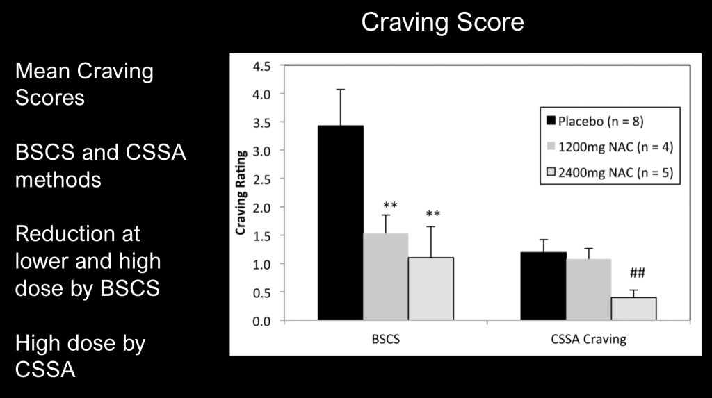 Decreased craving scores on two subjective rating scales demonstrating decreased dose dependant craving. NAC is sometimes used off label in cocaine use disorder as an adjunct to psychosocial intervention.