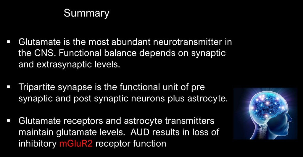 The tripartite synapse is the functional unit consisting of pre and post synaptic neurons and surrounding astrocytes. An array of receptors and transporters regulate glutamate levels. Research has focused on the mGluR2 receptors which function as feedback negative regulators of glutamate transmission. These receptors have been shown to be under expressed in substance use disorders resulting in long-term imbalance contributing to relapse.