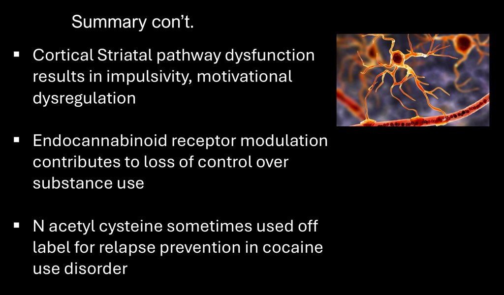 Over the past 30 years there has been rapid advancement in understanding the neurobiological basis of substance addiction. Progressive loss of control and relapse are characteristic in substance use disorder. There are unanswered questions concerning relapse at the cellular level.