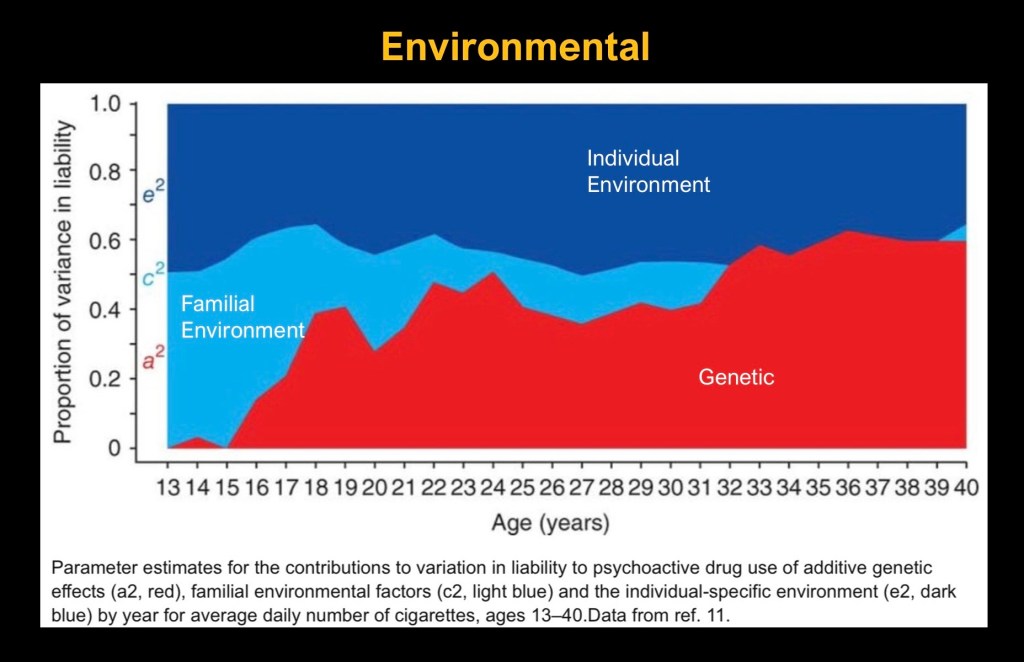 At early ages through late adolescence family factors have the largest influence. Through the later teens through adulthood family takes a decreasing role and genetic factors along with the external environment increase in importance.