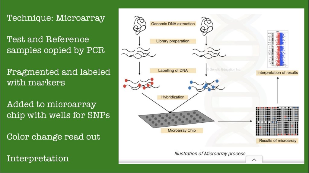 Microarray is a technique allowing for high volume analysis of DNA. The process begins with extraction of DNA from host tissue such as blood or cheek swab. Following amplification the DNA is fragmented and a library of segments is prepared and tagged with a fluorescent marker. The reference sample is also tagged with a different color marker