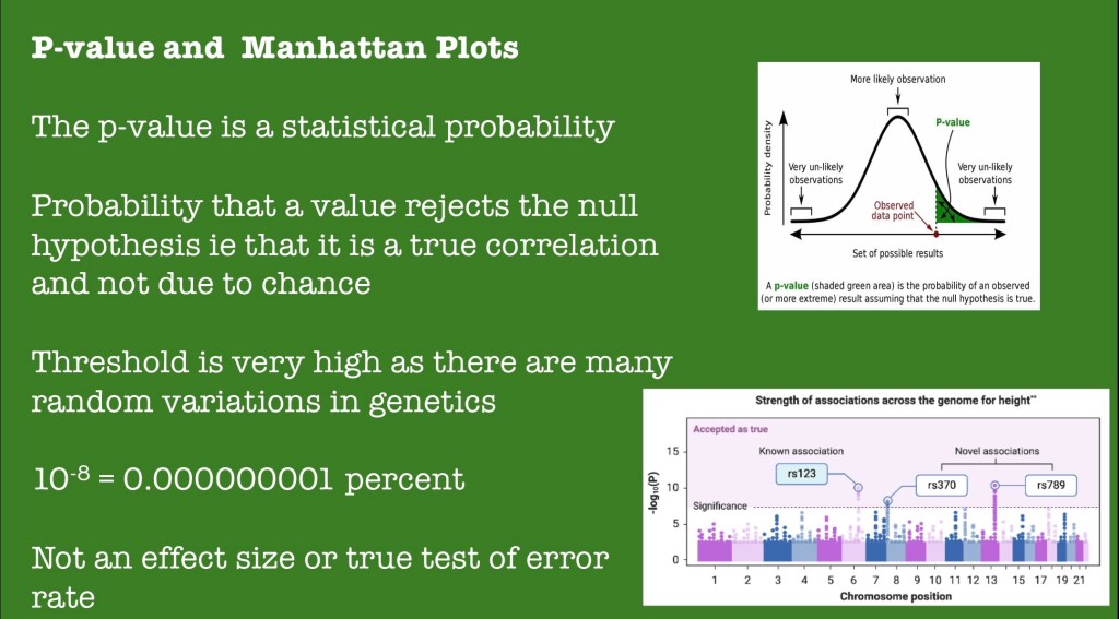 In the human genome of 3 billion base pairs many variations are present unrelated to the trait under study. The significance threshold is commonly set at 0.00000001% probability of occurring by chance.