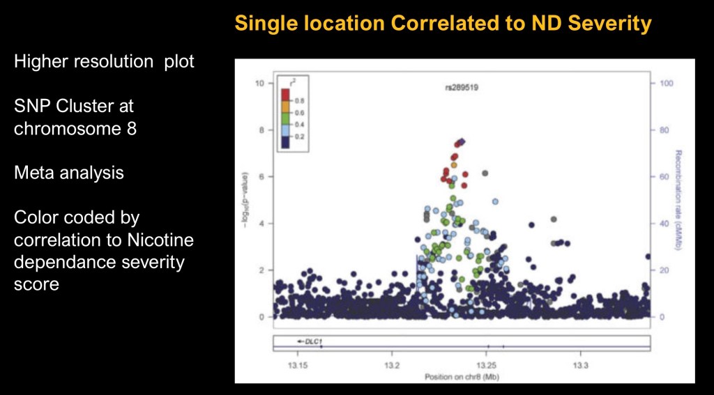 This is a closeup map of a segment cluster associated with ND on chromosome 8. Color coding reflects associated ND dependence severity score, This demonstrates the potential for developing bio markers reflecting quantitative disease severity rather than a more limited binomial test.