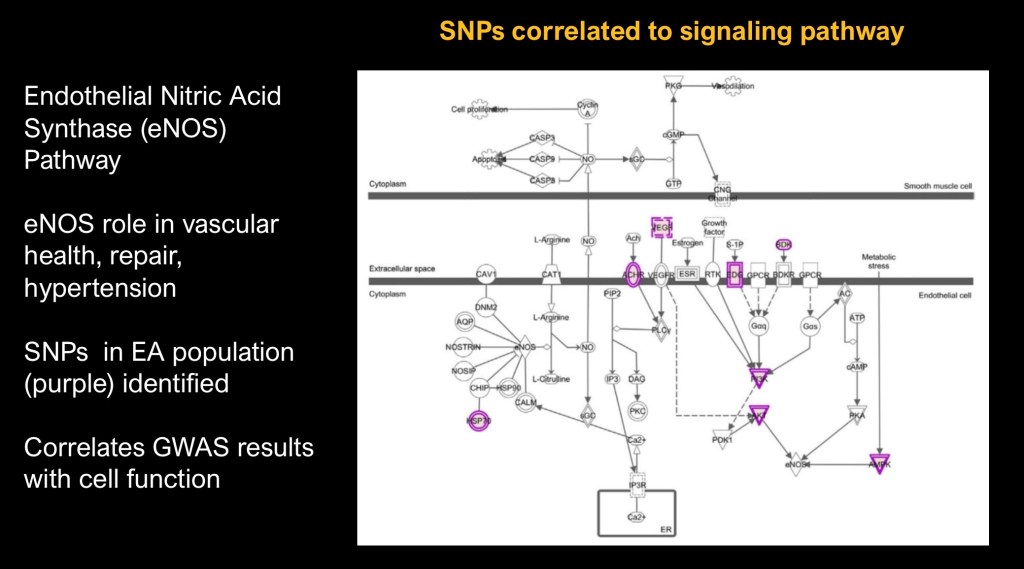 This is a correlation between GWAS findings and a cellular biological pathway. The above diagram reflects the endothelial nitric acid sythase pathway correlated to SNPs associated with ND in the studied population.