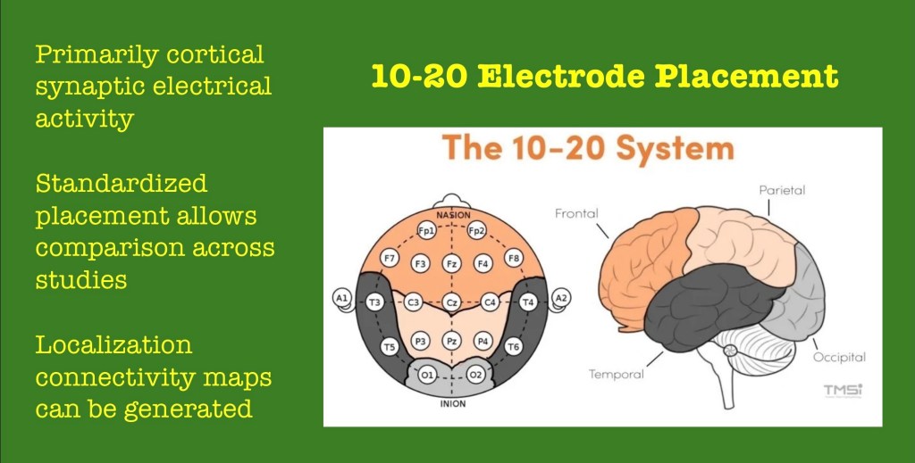 Electroencephalograms are a well established diagnostic tool in clinical medicine and in research. The study uses scalp electrodes placed most often in the above 10-20 system. Standardized placement allows for comparisons and longitudinal data.