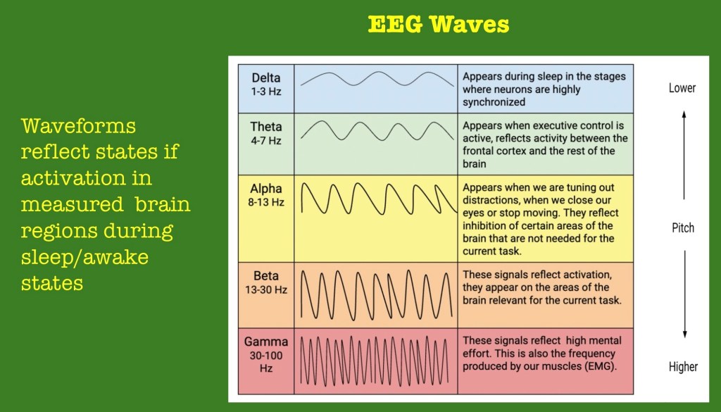The lower to higher frequency ranges indicate states of relative lower to higher neural activity during sleep or while awake. The test is non invasive and data can be collected and correlated in longitudinal studies.