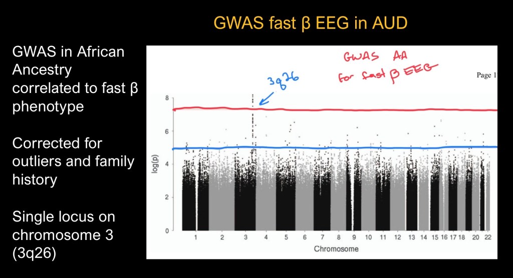 This plot reflects GWAS correlating to both AUD and presence of the fast β EEG pattern, A single locus correlated to both nicotine dependance and EEG findings was isolated on chromosome 3 position 3q26.