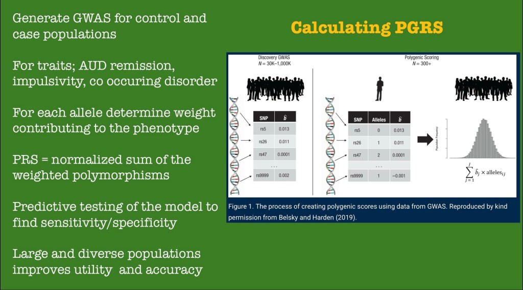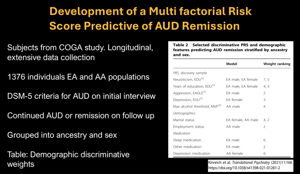 The next study involves development of a multi factorial polygenetic risk score predictive of remission from alcohol use disorder. The study involved 1376 individuals from the COGA longitudinal study population. Multivariate analysis was used with a machine learning approach.