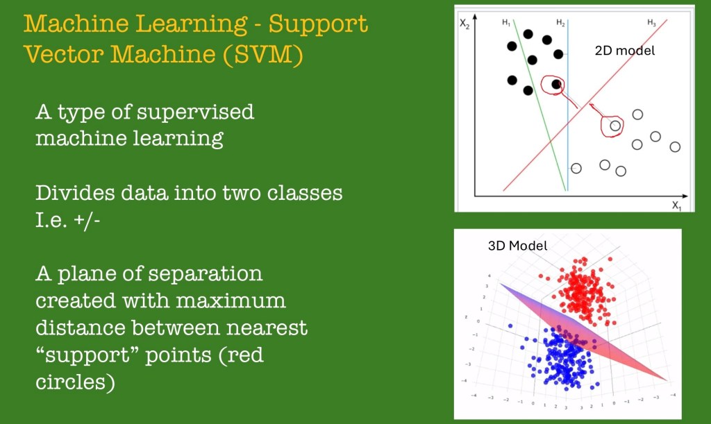 Support Vector Machine Learning is a type of machine learning often used to separate data into a binary +/- classification.