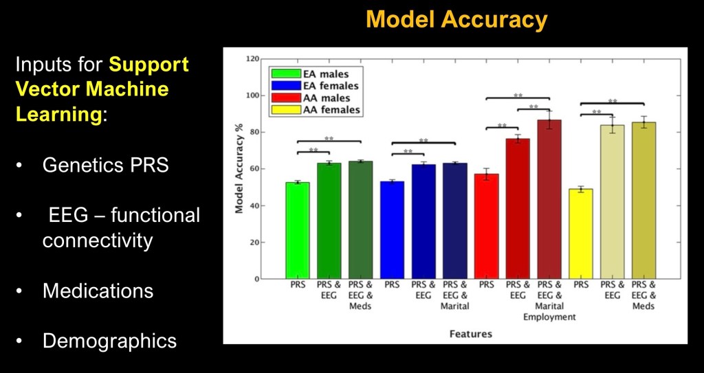 The predictive risk score was derived from genetic GWAS, demographic variables such as employment, marital status, or medications along with EEG data. These factors were used to construct a support vector machine algorithm predictive of remission from AUD.