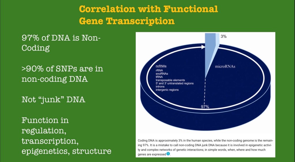 97% of DNA in the human genome is non-coding, meaning it does not directly code for a protein. Formerly described as “junk DNA” it is now known that non coding DNA often is important in gene expression, regulation, and structure.