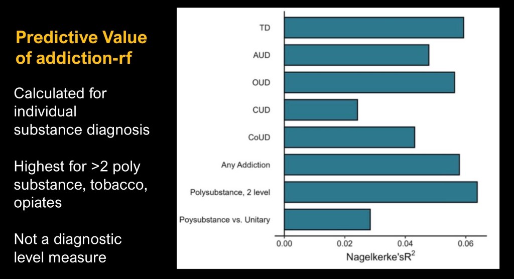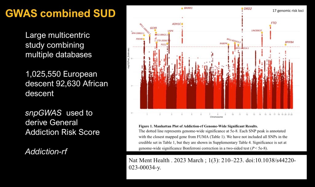 The largest GWAS to date combined data from over one million individuals correlated to risk of general substance use disorder. This study utilized this data set to derive a composite addiction risk score addiction-rf.