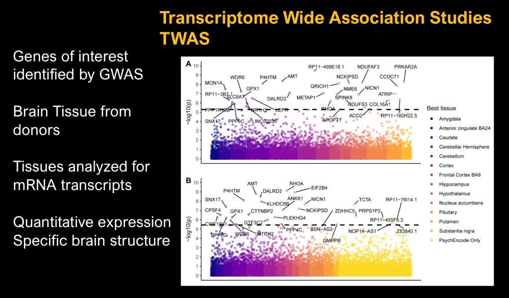 Based on addiction-rf transcription wide association study (TWAS) was conducted utilizing mRNA data localized to specific brain structures from donated cadaveric brain tissue. The plots above identify specific genes actively transcribed associated with clinical SUD. Color coding identifies specific structural brain locations. The two graphs reflect data derived from different databanks.