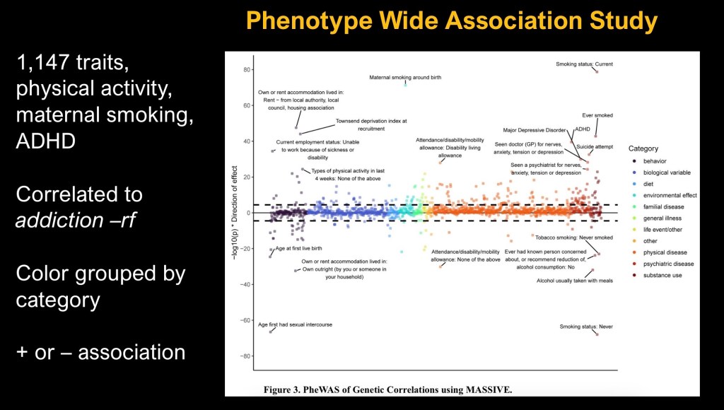 The risk score addiction-rf was further correlated to a data bank of 1,147 traits to derive a phenotype wide association study. This included information such as employment status, maternal smoking at birth, and history of ADHD. Points above the baseline represent positive effect and below represent a negative direction of effect.